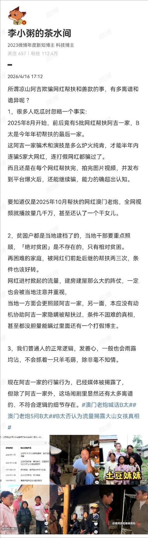 澳门老炮的质疑或许从某些角度上看,也有点站不住脚,但综合而言阿吉一家的五连骗折射出来的,是流量时代公益帮扶的深层困境。